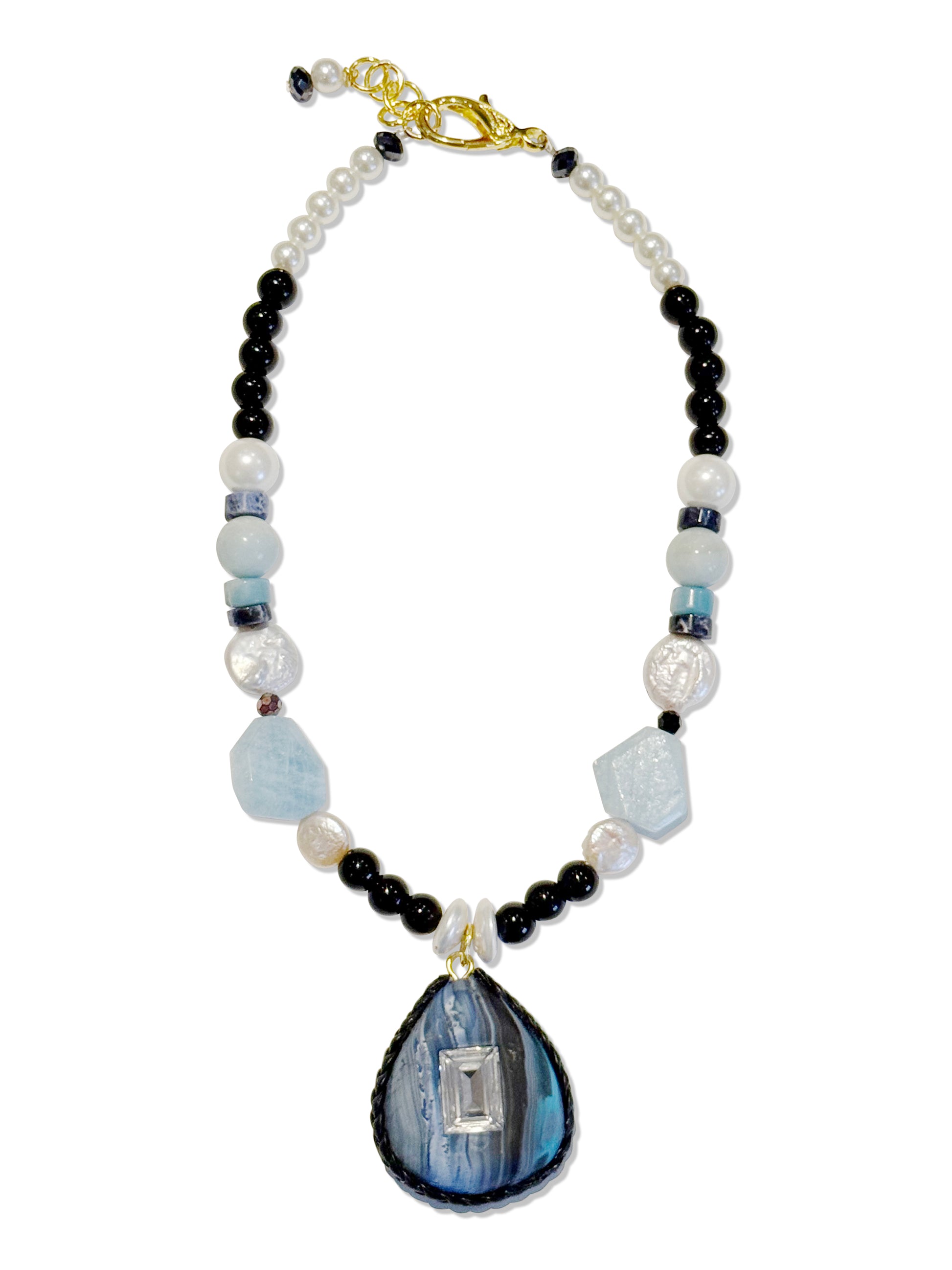 Embrace the tranquility of the ocean with Ocean Blues, a mesmerizing necklace designed to captivate. Crafted with lustrous freshwater pearls. Serene blue hue tones with carefully selected semi-precious beads and brilliant Swarovski crystals, this piece radiates sophistication and refinement.