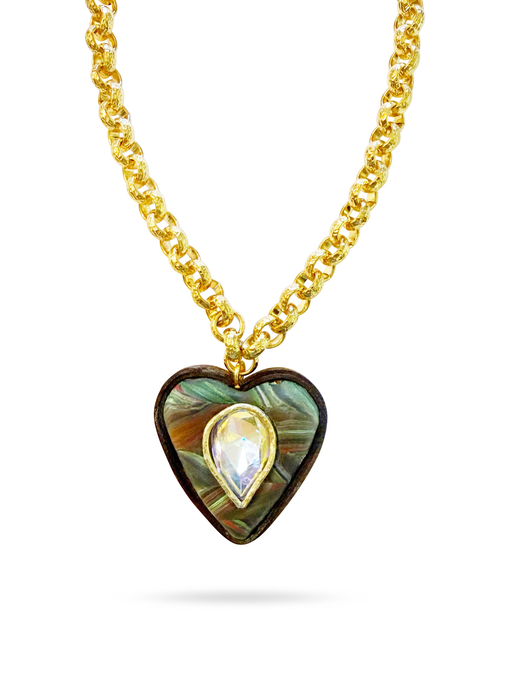 The Sheba Heart Statement Necklace showcases a refined Moroccan bohemian design in harmonious shades of green and brown. Crafted to make a lasting impression, this necklace combines artistic elegance with earthy tones, offering a sophisticated accessory that enhances any wardrobe with its distinctive, heartfelt charm.