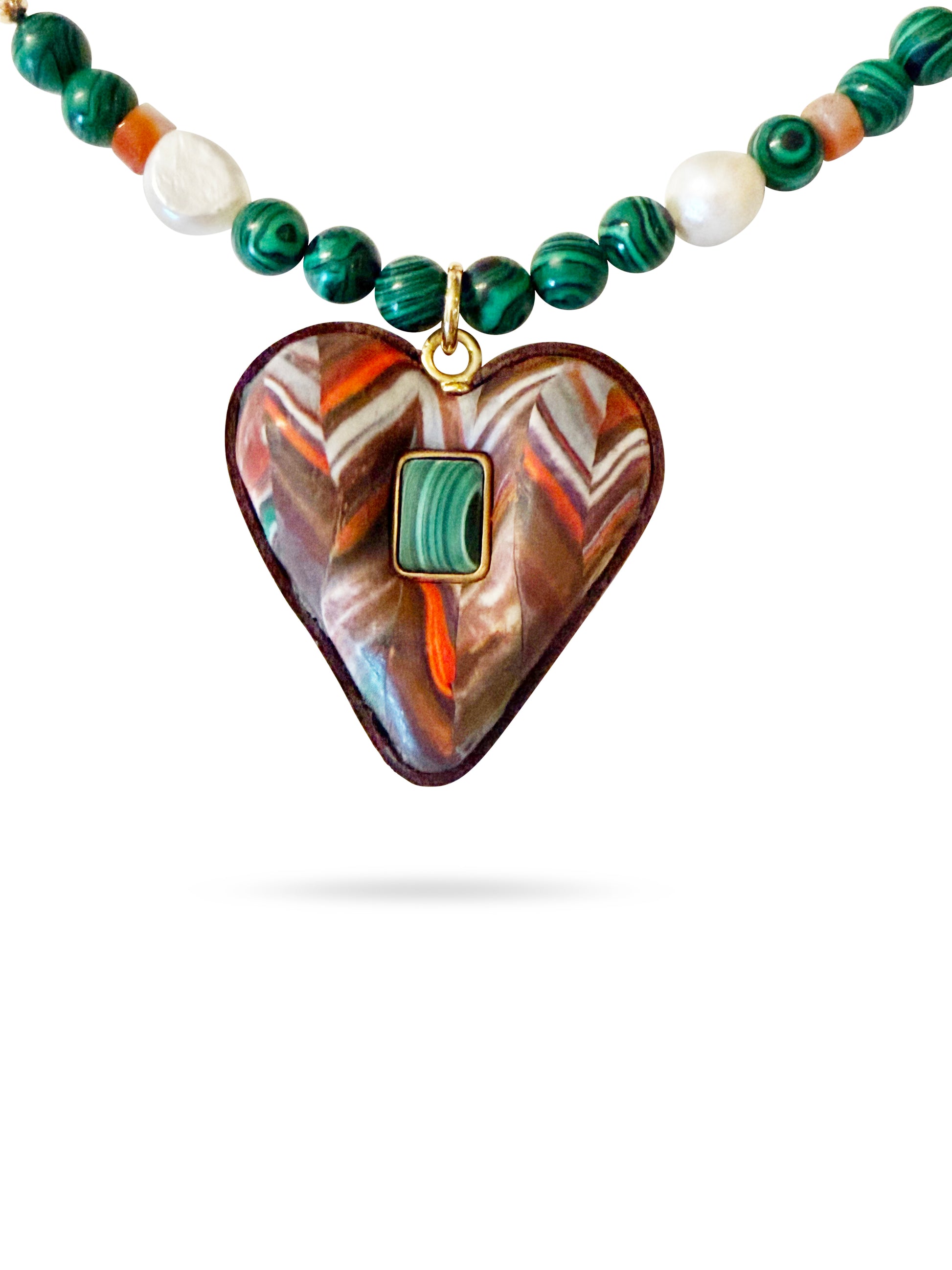 Embrace boho charm with The Fez Statement Handmade Necklace, featuring a playful heart-shaped pendant crafted from polymer clay with a stunning malachite cabochon. Adorned with malachite beads and fresh water pearls, all strung on a supple leather cord, this Moroccan-inspired piece adds a whimsical touch to any outfit.